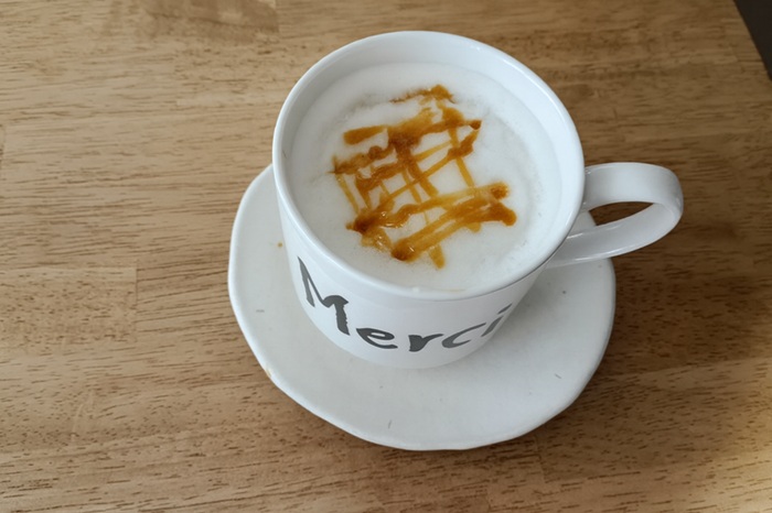 ④フォームミルクを入れ、飾り用のキャラメルソースをかけて出来上がり。