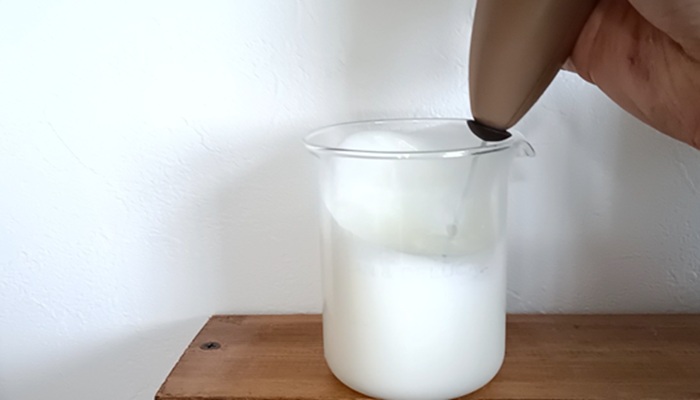 HARIOのフォーマーは威力が強くて、数十秒でビーカーいっぱいに膨らみます。